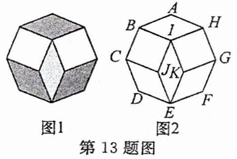 13. 新考向 真实情境 (2024·朔州右玉县二模)图 1 是某创意图书馆设计的一款壁灯图案的设计图, 象征着欣欣向荣, 代表一种生机盎然的自然和谐美. 图 2 是从图 1 所示的图案中提取的图形, 已知正八边形 $ABCDEFGH$ 被分割成两个正方形和四个菱形, 则 $\angle JIK =$ ________.