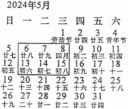 2. (2024·晋中榆社县模拟)“五一国际劳动节”是世界上80多个国家的全国性节日,中国于1949年12月作出决定,将5月1日确定为“劳动节”.如图所示的是2024年5月的月历表,用一个方框在表中圈出六个数,若圈出的六个数中,最小的数与最大的数的乘积为136,求这个最小的数(请用方程知识解答).