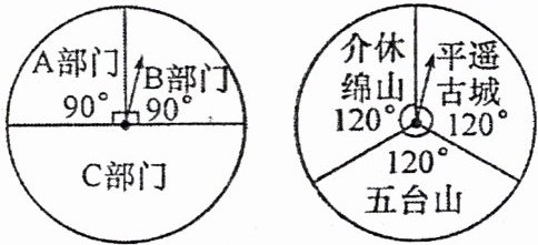 5. 山西景色宜人,其中介休绵山、平遥古城、五台山景点的景色更是美不胜收.某单位为兼顾生产和业余生活,决定在下设的A,B,C三个部门利用转盘游戏确定参观的景点.两转盘各部分圆心角大小以及选派部门、旅游景点等信息如图.
