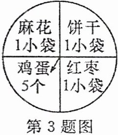 3. 新考向 真实情境(2024·运城盐湖区期中)某商场促销的方案如下:在本商场一次性购物超过$ n $元,就可以参加转转盘抽取稷山四宝的活动,转盘如图所示(一个可以自由转动的转盘被分成面积相等的4个扇形,在4个扇形上分别写有:麻花1小袋、饼干1小袋、鸡蛋5个、红枣1小袋的文字).每个参与者转动转盘两次,当两次指针都指向同一物品时,就领取指针指向的物品,当两次指针指向的物品不一样时,则不领取任何物品(若指针指向两个扇形的交线,则不计转动的次数,重新转动转盘,直到指针指向一个扇形的内部为止).则一个参加转转盘的购物者能领取到红枣1小袋的概率是(