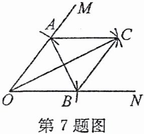 7. 如图,在∠MON的两边上分别截取OA,OB,使OA=OB,分别以点A,B为圆心,OA长为半径作弧,两弧交于点C,连接AC,BC,AB,OC.若AB=2cm,四边形OACB的面积为4cm²,则OC的长为