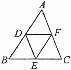 4. (教材 P80 例 2 变式)如图,在$\triangle ABC$中,$D,E,F$分别为$AB$,$BC,AC$的中点,连接$DE,DF$,$EF$,则$\frac{DE + EF + DF}{AC + AB + BC}$的值为