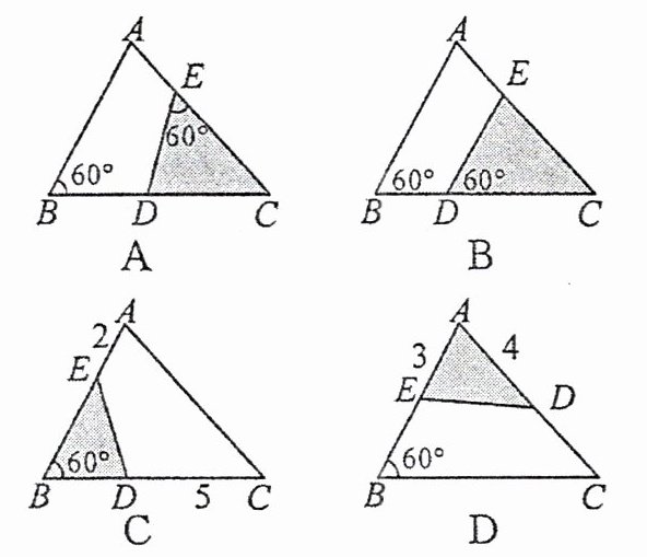 9. (2024·太原市志达中学月考)如图,已知△ABC,∠B=60°,AB=6,BC=8.将△ABC沿图中的DE剪开,则剪下的阴影三角形与△ABC不相似的是(