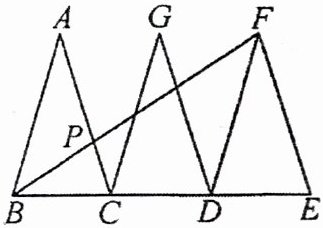 12. 如图,△ABC,△GCD,△FDE是三个全等的等腰三角形,点B,C,D,E在同一条直线上,且$AB=\sqrt{3}$,BC=1,BF交AC于点P.