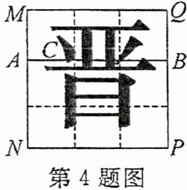 4. 新考向 跨学科(2024·山西)黄金分割是汉字结构最基本的规律.借助如图所示的正方形习字格书写的汉字“晋”端庄稳重、舒展美观.已知一条分割线的端点A,B分别在习字格的边MN,PQ上,且AB//NP,“晋”字的笔画“”的位置在AB的黄金分割点C处,且$\frac{BC}{AB}=\frac{\sqrt{5}-1}{2}$.若NP=2cm,则BC的长为