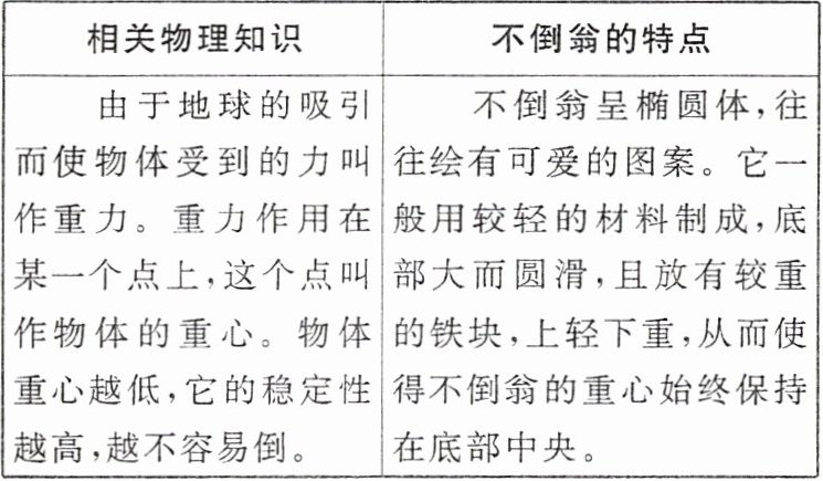 |由于地球的吸引而使物体受到的力叫作重力。重力作用在某一个点上,这个点叫作物体的重心。物体重心越低,它的稳定性越高,越不容易倒。|不倒翁呈椭圆体,往往绘有可爱的图案。它一般用较轻的材料制成,底部大而圆滑,且放有较重的铁块,上轻下重,从而使得不倒翁的重心始终保持在底部中央。|