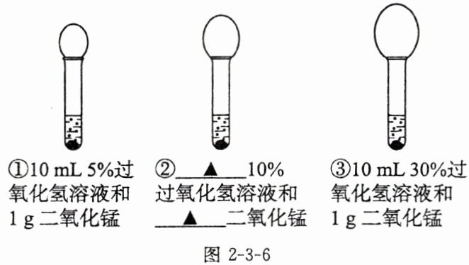 9. 为探究过氧化氢溶液浓度对过氧化氢分解速率的影响,同学们设计了如图2-3-6所示三个实验:将二氧化锰放在气球中,实验时将二氧化锰同时倒入试管中,在反应结束前的某一时间同时观察,现象如图所示。