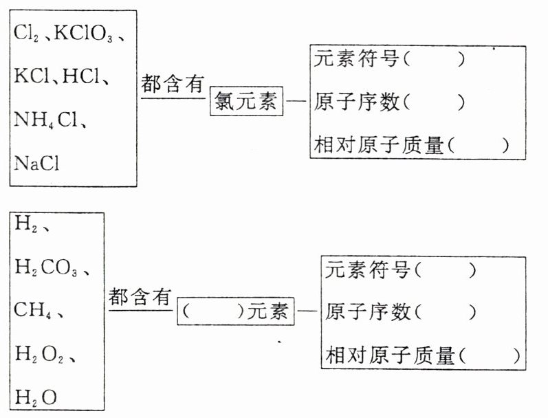 $\boxed{Cl_{2}、KClO_{3}、KCl、HCl、NH_{4}Cl、NaCl}$ 都含有$\boxed{氯元素}$—$\boxed{\begin{aligned}&元素符号(\quad)\\&原子序数(\quad)\\&相对原子质量(\quad)\end{aligned} }$