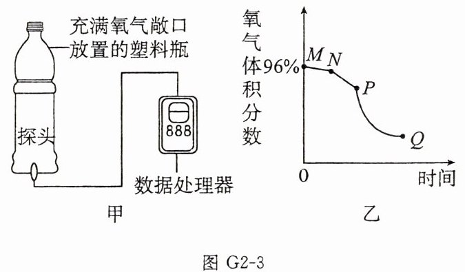 收集一塑料瓶氧气后从塑料瓶底部的小孔插入氧气浓度探头(如图G2-3甲),并进行以下三步实验:①敞口放置;②双手贴在塑料瓶的外壁上;③将塑料瓶的瓶口朝下。三步实验中测得氧气的体积分数随时间变化的曲线依次为乙中的MN段、NP段和PQ段。