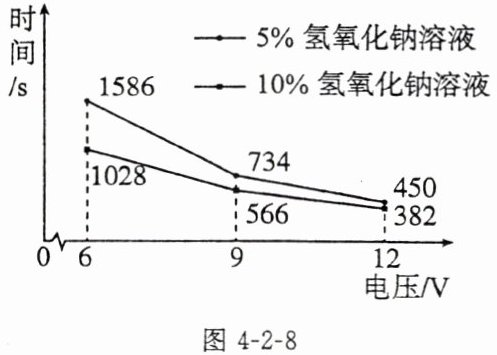 (5)电解水速率较慢,为探究不同电压和不同浓度氢氧化钠溶液对电解水速率的影响,小组同学进行多次实验,测得产生20 mL氢气所需时间如图4-2-8所示。