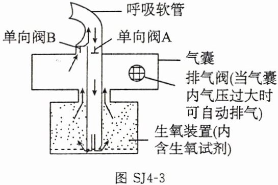 ②图 SJ4-3 是兴趣小组同学设计的一款自救呼吸器(其中箭头方向表示气体流动方向)。自救呼吸器使用时,需用鼻夹夹住鼻子,用嘴咬合呼吸软管进行呼吸。在正常呼气时,单向阀A和B的开闭情况是______(填“A打开,B闭合”或“A闭合,B打开”)。
