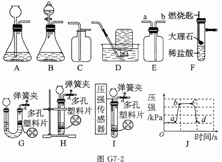 (4)实验室若选用F装置作为制取二氧化碳的发生装置,铜制燃烧匙可在试管内上下移动,此装置与将大理石直接放入稀盐酸中相比,其主要优点是______。G、H装置同样具备该优点,为了解G、H装置具有该优点的原因,他们在H装置中连接压强传感器(如I装置),从而测定实验中试管内气体压强变化的情况(如图J)。下列说法正确的是______(填序号)。