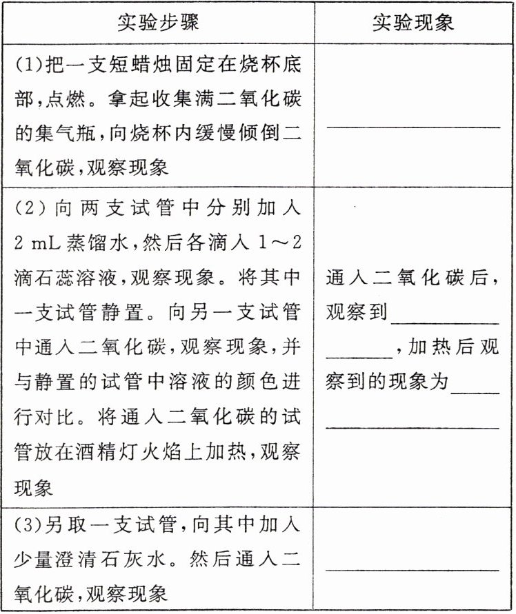 |(2)向两支试管中分别加入2 mL蒸馏水,然后各滴入1~2滴石蕊溶液,观察现象。将其中一支试管静置。向另一支试管中通入二氧化碳,观察现象,并与静置的试管中溶液的颜色进行对比。将通入二氧化碳的试管放在酒精灯火焰上加热,观察现象|通入二氧化碳后,观察到______,加热后观察到的现象为______|