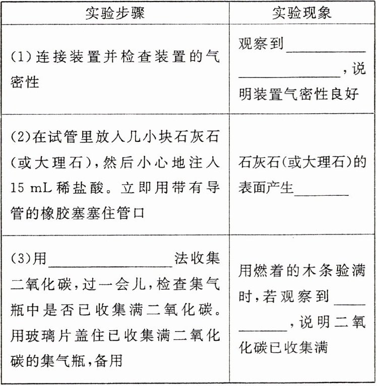 |(2)在试管里放入几小块石灰石(或大理石),然后小心地注入15 mL稀盐酸。立即用带有导管的橡胶塞塞住管口|石灰石(或大理石)的表面产生______|
