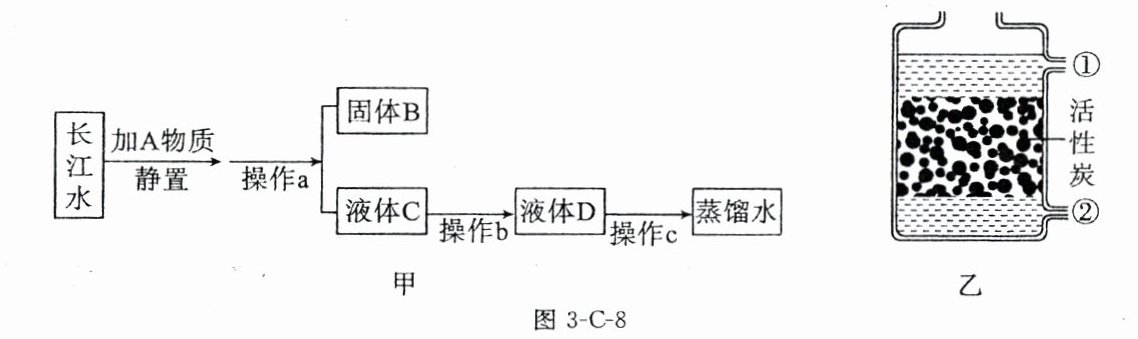 19. (6分)水是地球表面覆盖最多的物质,也是生命活动不可缺少的物质。某兴趣小组在实验室模拟水厂将浑浊的长江水净化成自来水,并最终制成蒸馏水,实验流程如图3-C-8甲所示。请回答: