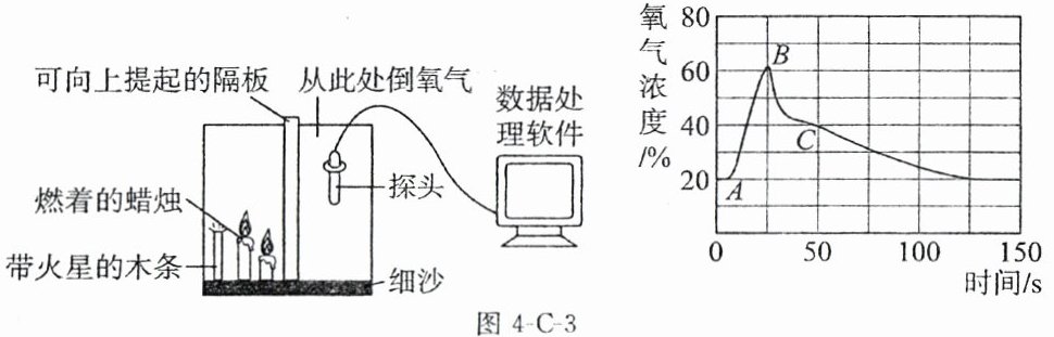 15. 【新考法·数字化实验】某实验小组为探究氧气的性质,利用传感器绘制氧气浓度与时间的曲线图。曲线在AB段时,隔板未提起;曲线在BC段时,隔板稍微向上提起。通过该实验不能获取的信息是(