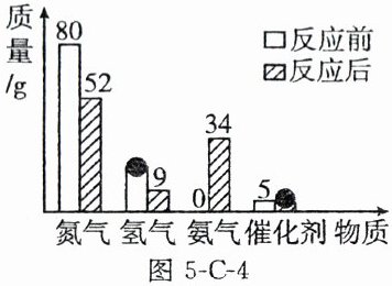 14. (2024 河北)当前,氨气($NH_{3}$)的能源化应用逐渐成为研究热点。工业上常用氮气和氢气合成氨气,一定条件下,在密闭容器中加入反应物和催化剂进行该反应,反应前后各物质的质量如图5-C-4所示,图中有两处被墨迹遮盖。下列说法正确的是(