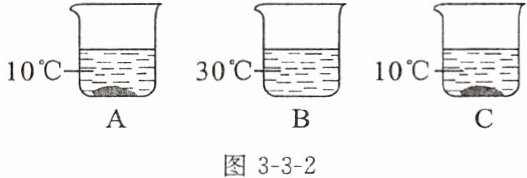 4. A、B、C三个烧杯中盛有相同质量的水(其中A、C烧杯中水温为$10\ ^{\circ}C$,B烧杯中水温为$30\ ^{\circ}C$,不考虑溶解过程中温度的变化),分别加入硝酸钾固体各10 g,充分溶解后现象如图3-3-2所示。请回答: