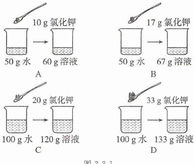 1. $20\ ^{\circ}C$时,100 g水中最多能溶解34 g氯化钾。下列是四名同学在$20\ ^{\circ}C$时配制的氯化钾溶液,其中一定达到饱和的是 (