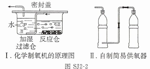 化学制氧机(原理图见图 SJ2-2Ⅰ)利用过碳酸钠白色固体、二氧化锰黑色粉末产生氧气。过碳酸钠($2\mathrm{N}{\mathrm{a}}_{2}\mathrm{C}{\mathrm{O}}_{3}\cdot 3{\mathrm{H}}_{2}{\mathrm{O}}_{2}$)加水溶解会分解生成碳酸钠和过氧化氢。用该制氧机制氧时,在反应仓中加入适量水,再先后加入过碳酸钠和二氧化锰,反应仓内有黑色粉末翻腾,变得浑浊,仓壁变得温热,过滤仓底部导气管口有气泡冒出。