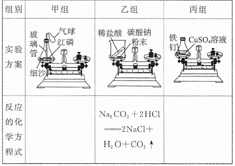 [实验探究]同学们用托盘天平分别称量甲、乙、丙三组实验反应前后物质和装置的总质量。