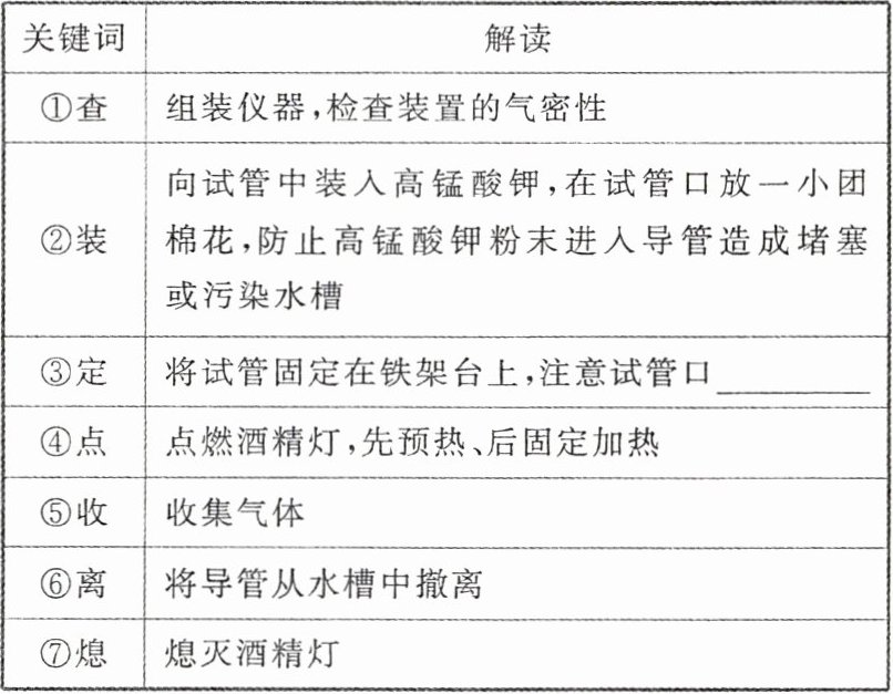| ②装 | 向试管中装入高锰酸钾,在试管口放一小团棉花,防止高锰酸钾粉末进入导管造成堵塞或污染水槽 |