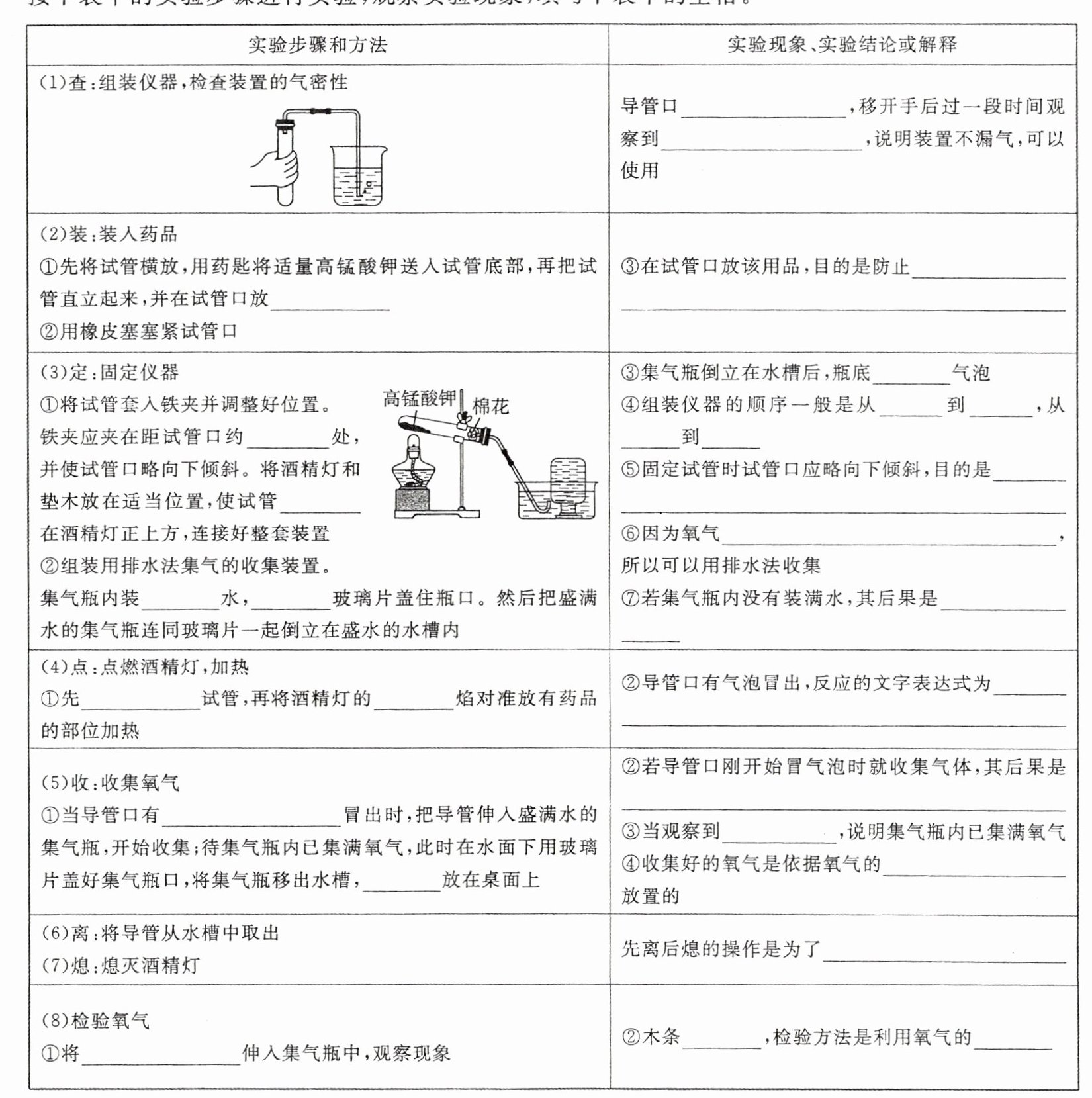 ②用橡皮塞塞紧试管口|③在试管口放该用品,目的是防止高锰酸钾粉末进入导管造成堵塞或污染水槽