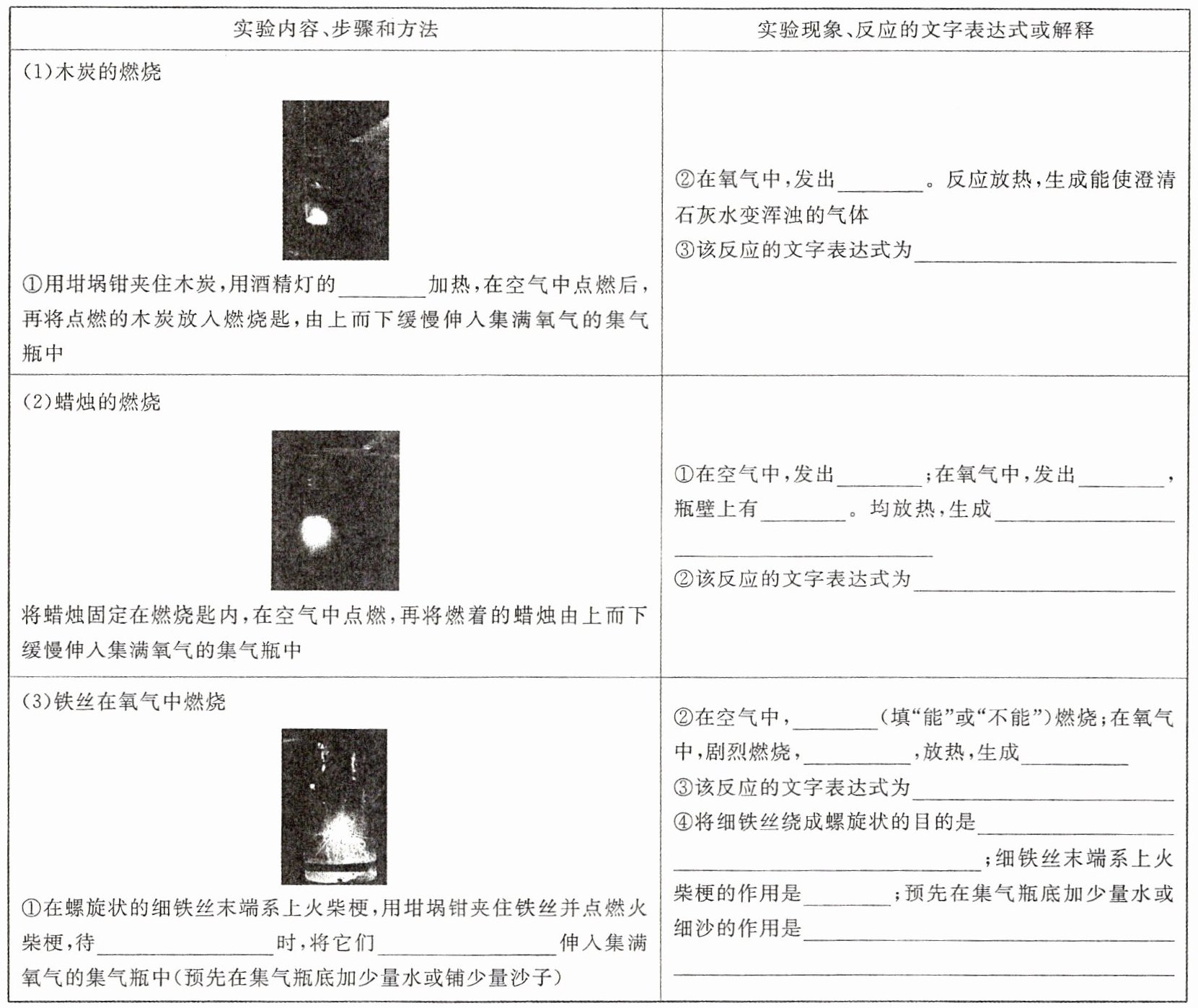 ||(2)蜡烛的燃烧将蜡烛固定在燃烧匙内,在空气中点燃,再将燃着的蜡烛由上而下缓慢伸入集满氧气的集气瓶中|①在空气中,发出