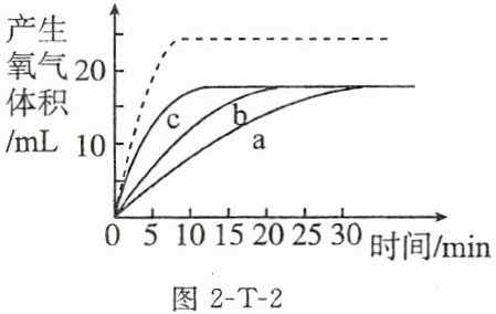 。[定量探究二]硫酸铜也能作过氧化氢分解的催化剂,小组同学在常温下,向a、b、c三支试管中分别加入等量5%的过氧化氢溶液,在其他条件相同时,各滴入2滴5%、10%、20%的硫酸铜溶液,绘制了产生氧气的体积随时间变化的曲线(图2-T-2)。