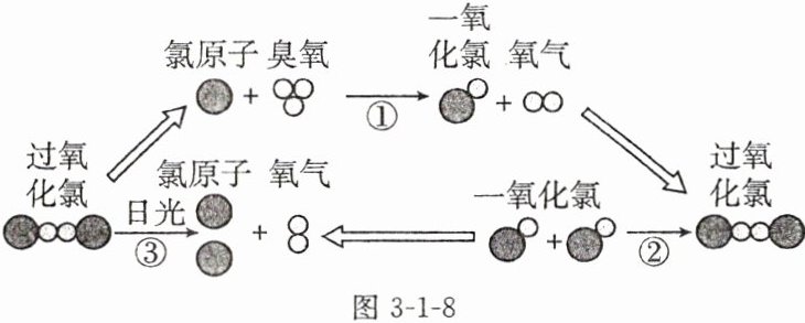 14. 氟利昂是一种常见的制冷剂。氟利昂在紫外线的照射下能分解出氯原子,破坏臭氧层,其破坏臭氧的循环示意图如图3-1-8。