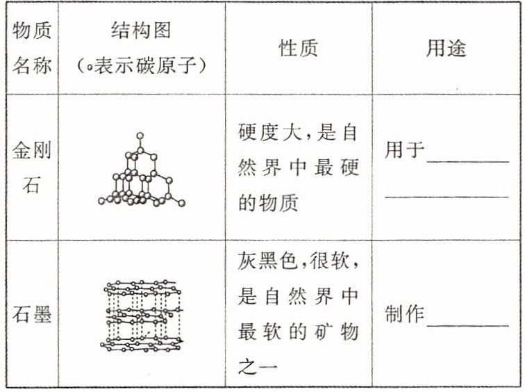 |金刚石||硬度大,是自然界中最硬的物质|用于