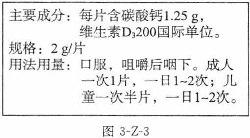 10. 钙是身体内重要的常量元素,对身体的发育起到非常重要的作用。如图3-Z-3是某钙片的部分说明书,请分析: