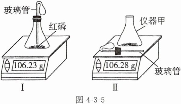 9. (2024武汉)化学项目小组用图4-3-5Ⅰ所示装置验证质量守恒定律。点燃红磷前电子天平示数为106.23g(见图Ⅰ)。验证质量守恒定律后,待白烟完全沉降取下橡皮塞,片刻后再一起称量,电子天平示数稳定为106.28g(见图Ⅱ)。