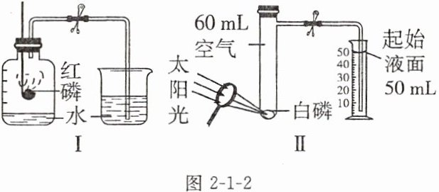 6. 某实验小组想用不同的装置探究空气中氧气的含量,于是进行了图2-1-2所示实验(图Ⅱ中太阳光能引燃试管里面的白磷,产物与红磷燃烧的产物相同)。