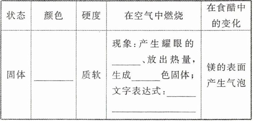 |固体|______|质软|现象:产生耀眼的______、放出热量,生成______色固体;文字表达式:______|镁的表面产生气泡|