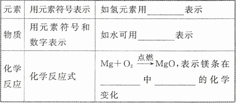 |化学反应|化学反应式|$Mg+O_2\xrightarrow{点燃}MgO$,表示镁条在______中______的化学变化|