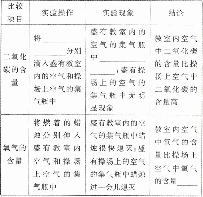 |二氧化碳的含量|将______分别滴入盛有教室内的空气和操场上空气的集气瓶中|盛有教室内的空气的集气瓶中______;盛有操场上的空气的集气瓶中无明显现象|教室内空气中二氧化碳的含量比操场上空气中二氧化碳的含量高|