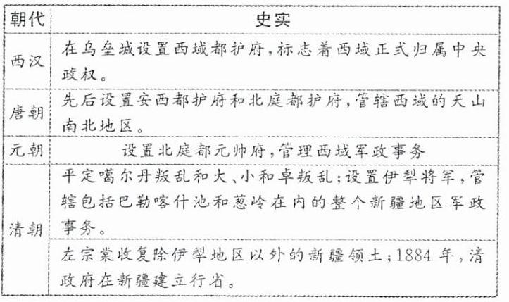 情境任务4 【教材P28“课后活动2”改编】列表梳理我国历代王朝对新疆、台湾地区管辖的措施。19世纪80年代清政府在新疆、台湾建省,有什么共同意义?通过表格梳理,你有什么认识?(6分)