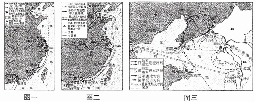 情境任务2 观察图一到图三,概括近代列强侵略中国的特点。结合三幅图片反映的侵华战争,说明加强海洋防卫的重要性。(4分)