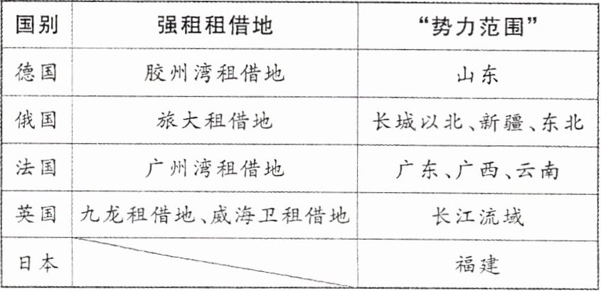 材料二 列强在华强租租借地和划分“势力范围”情况表