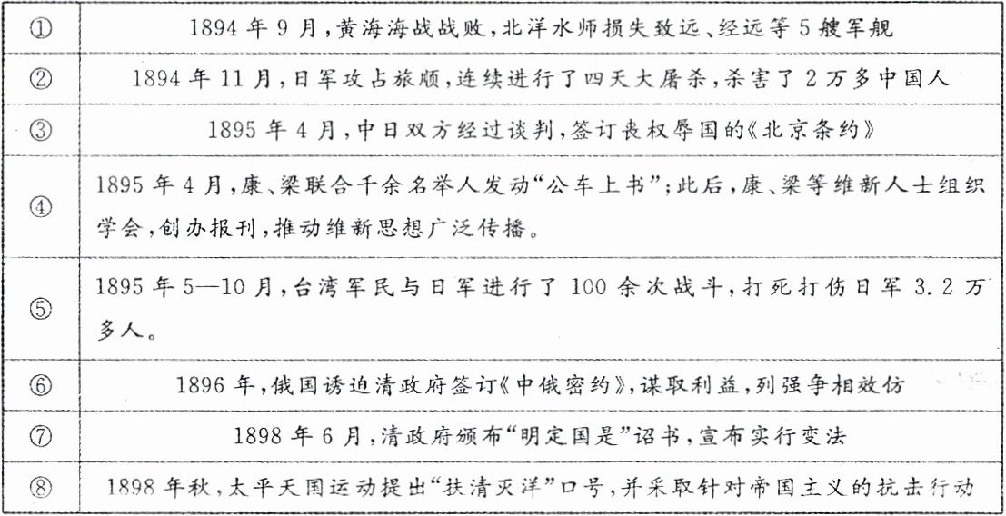 18.(1)③将《北京条约》改为《马关条约》。⑧将“太平天国运动”改为“义和团运动”。 (2)正方 ④⑦ (3)1895年,清政府与日本签订《马关条约》,甲午中日战争中国战败宣告洋务运动的破产。战后,列强掀起了瓜分中国的狂潮,民族危机的深重促使国人开始新一轮的救亡图存运动。如资产阶级维新派掀起了戊戌变法运动,主张通过学习西方政治制度的方式挽救民族危亡。民族资产阶级实业家走上“实业救国”道路,促进了中国民族工业的发展。所以说,甲午中日战争促使国人民族意识的觉醒,推动中国历史发展进程。