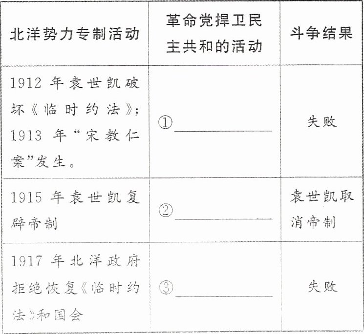 (1)①二次革命 ②护国战争 ③护法运动 认识:中国民主革命是一个艰难曲折且长期的过程。精神:热爱祖国,心系国家和民族命运;具有坚定的革命信仰;百折不挠、愈挫愈勇、永不言败的革命精神。