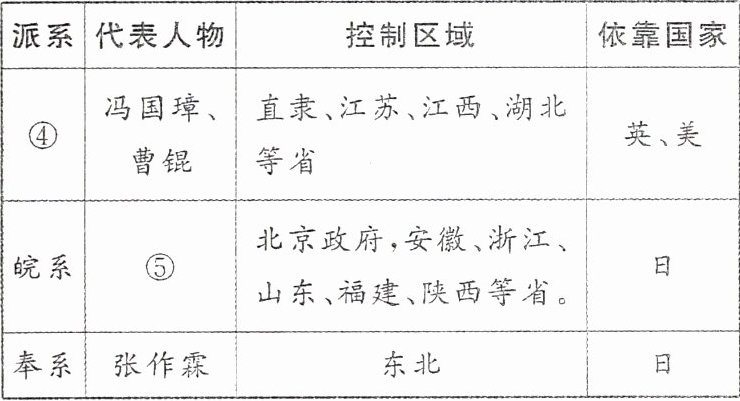 (2)④直系 ⑤段祺瑞 特点:对内割据一方,对外依附帝国主义,大小军阀不断混战。危害:军阀混战使中国处于动荡之中,破坏了社会经济,给人民带来灾难。
