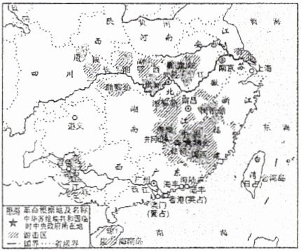 情境任务3 右面《农村革命根据地分布图(1929—1932年)》反映出“工农武装割据”局面的形成与发展,请在图中圈画出中华苏维埃共和国临时中央政府所在地,并写出你观察到的两个比较大的根据地名称。(3分)
