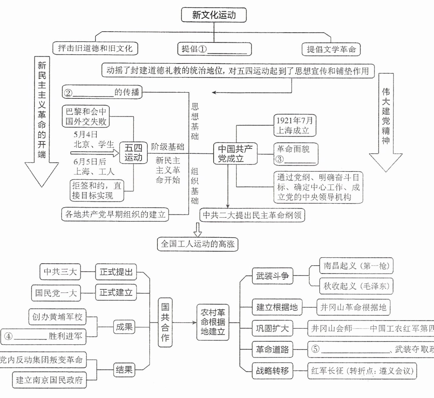【单元核心建构】①民主与科学 ②马克思主义 ③焕然一新 ④北伐 ⑤农村包围城市
