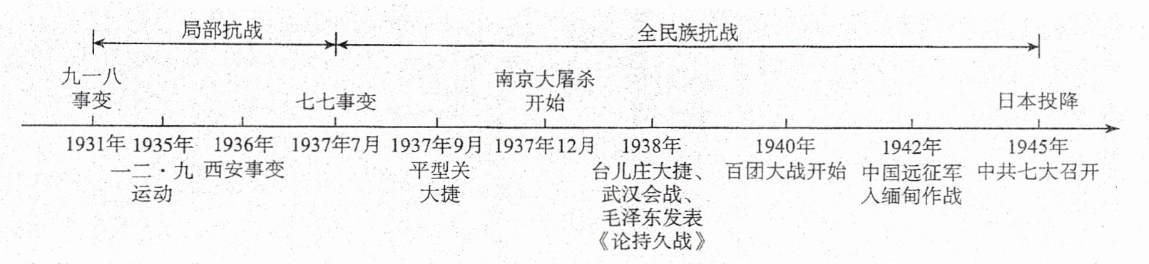 1 九一八事变 2 抗日民族统一战线 西安事变 抗日民族统一战线 3 七七事变(或卢沟桥事变) 全民族 抗日民族统一战线 4 人民游击 相互配合 5 中流砥柱 东方主战场 6 14