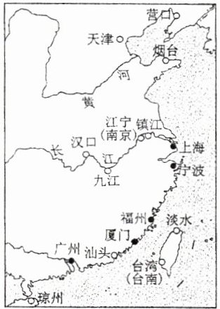 材料二 外国公使进驻北京;开放牛庄、登州、台湾(台南)、淡水、潮州、琼州、汉口、九江、南京、镇江为通商口岸;外国商船和军舰皆可驶入长江各口……