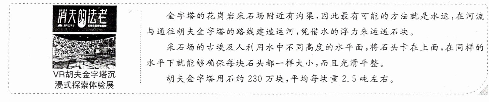 情境任务3 结合课本,说一说金字塔与古埃及法老有什么关系。根据材料推测古埃及人修建金字塔时可能运用了哪些知识。说一说金字塔被列为世界文化遗产的主要原因。(6分)