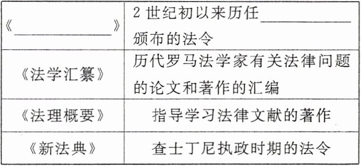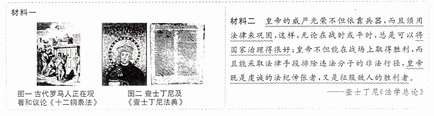 情境任务 1 根据本课内容写出材料一中图二这一法典的主要内容,并分析图一、图二反映的成果之间的关系。依据材料二,概括罗马法的发展对罗马国家的统治起到了什么作用。(6 分)