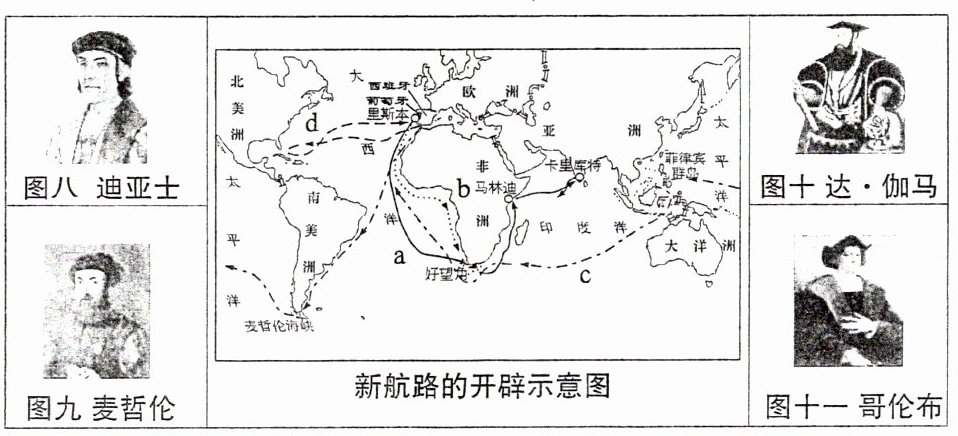 选麦哲伦,对应航线c。1519—1522年麦哲伦的船队第一次完成了环球航行,他成为第一位横渡太平洋的欧洲人,这次航行是世界航海史上的一次壮举,证明了地圆说的正确。(选择其他航海家也可)